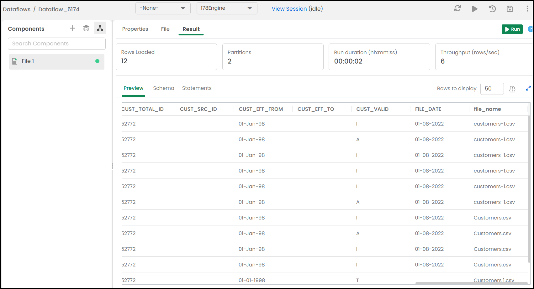 This tab displays the data of the file. The user can customize the number of rows to display in the output. The default count is 50.