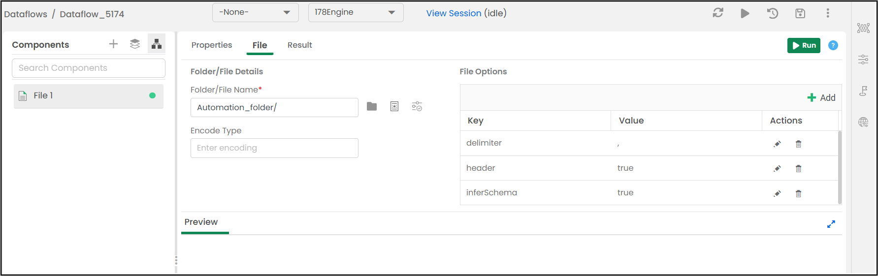 The read and write options for the selected file source will be displayed. Add new options or modify the existing ones. By default, you will see the options used while creating the data source connection. If there is a need to customize the options, use the add, edit, or delete buttons.