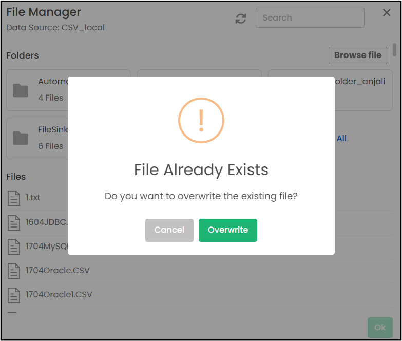 When you upload a file to the File Manager, the system checks if a file with the same name already exists in the selected data source location.