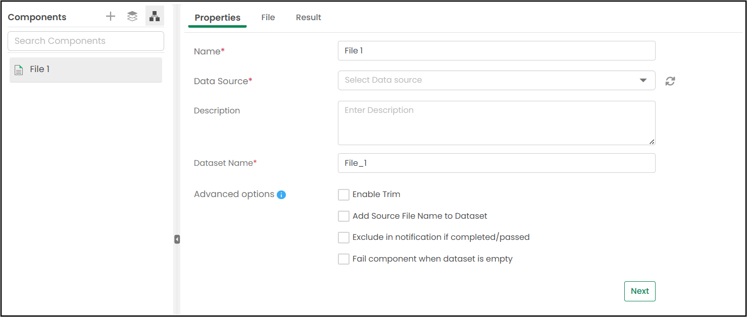 This is the first step in configuring the File component. Here, you define the basic settings for how the component should behave.