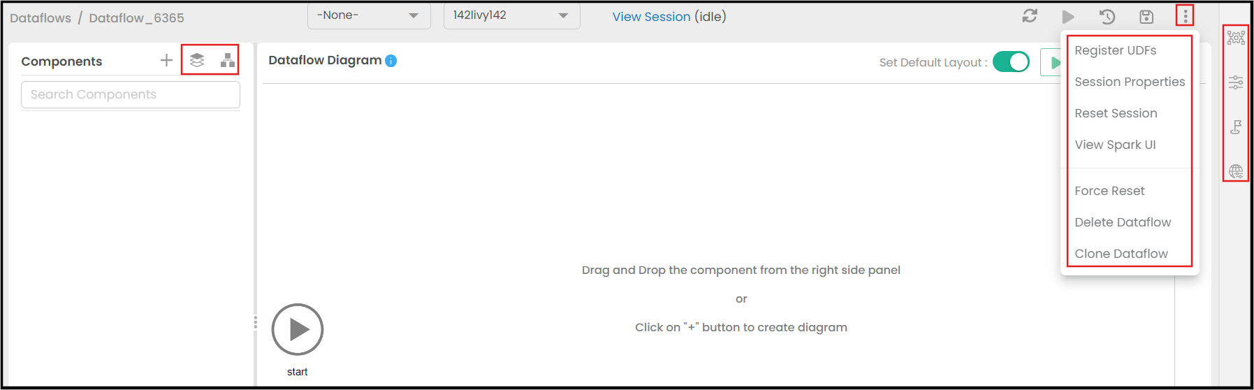 Dataflow actions are the fundamental operations the user can perform on dataflows. These actions allows the user to perform various actions, such as adding components, viewing datasets, switching to diagram view, downloading the full dataset, and accessing more options.